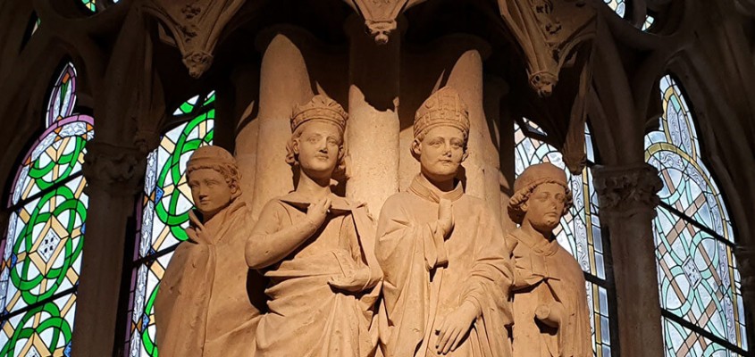 El magno acontecimiento quedaría plasmado en el claustro alto de la Catedral. Su ángulo sudeste se decora con un conjunto escultórico de finales del siglo XIII. Representa al obispo Mauricio y al rey Fernando III, acompañados de dos figuras, una civil y otra religiosa.
