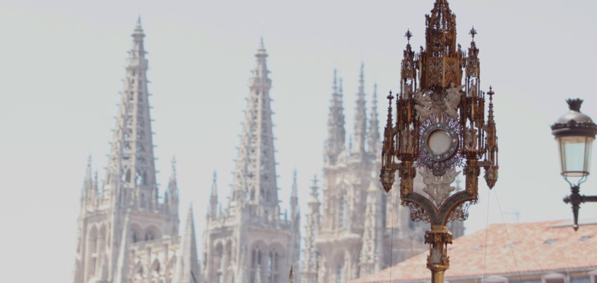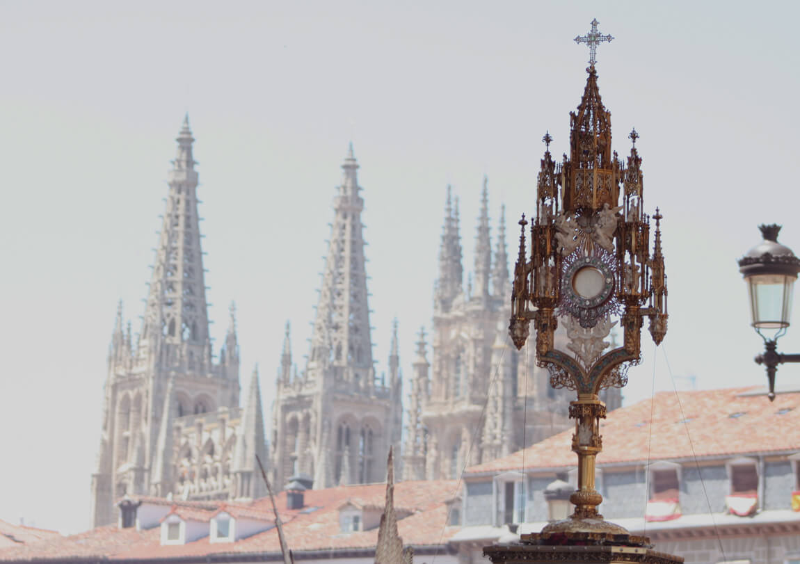La custodia de la Catedral de Burgos recorre las calles de la ciudad cada año durante la procesión del Corpus Christi. La procesión se traslada en Burgos al domingo posterior al día del Corpus, uno de esos jueves que brilla más que el sol.