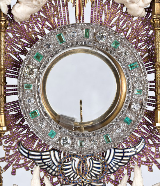 Sirve de marco a la Sagrada Forma una magnífica corona de esmeraldas y piedras preciosas, y el sol con rayos de oro y granate.