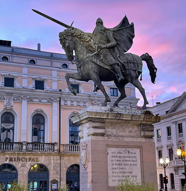 La estatua del Cid en Burgos es uno de los monumentos más emblemáticas de la ciudad. Junto con la Catedral de Burgos, se ha convertido en uno los iconos y de los lugares más fotografiados de la Caput Castellae. Representa al caballero de Vivar a lomos de su caballo, Babieca, empuñando su espada en alto, la legendaria Tizona.