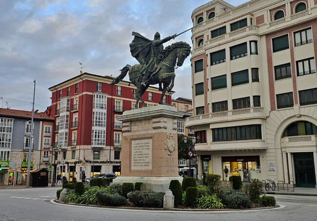 La estatua del Cid se ubica en la Plaza del Mío Cid, en pleno corazón de Burgos. En esa plaza arranca el paseo más popular de la ciudad, Paseo del Espolón, flanqueado en su comienzo por el Teatro Principal y la Diputación Provincial de Burgos.