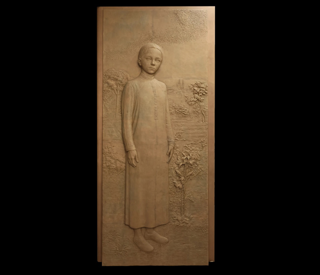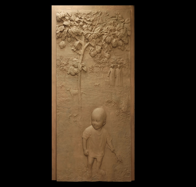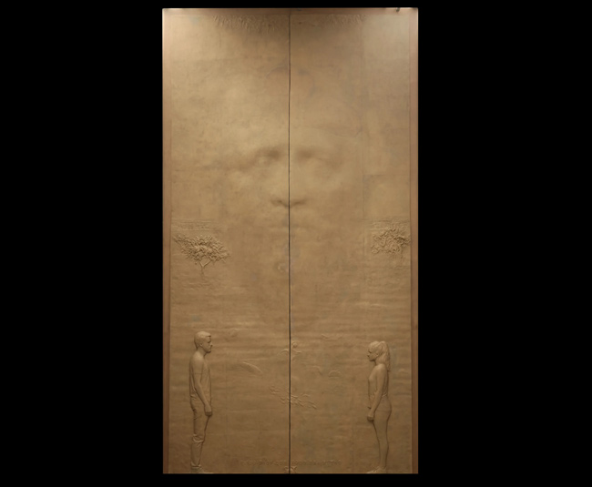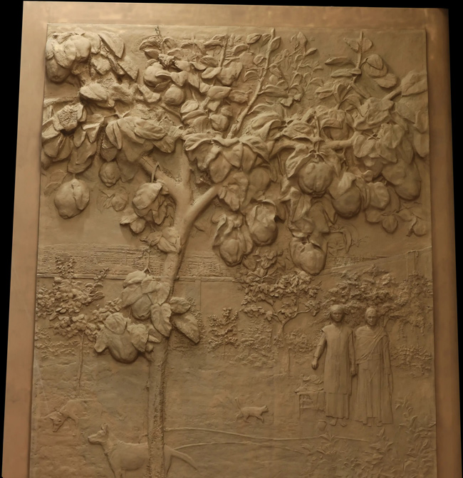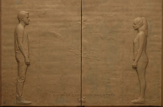 En la parte inferior, dos figuras humanas se miran, Adán y Eva. En la parte superior, los rayos celestiales de la Creación. El relieve parece capturar el instante en el que la creación comienza a despertar. La materia todavía vibra, como si estuviera tomando forma ante nuestros ojos. Antonio López utiliza estas imágenes para recordarnos de dónde venimos y para subrayar la belleza del mundo que habitamos, un mundo que no es casualidad, sino obra pensada.
